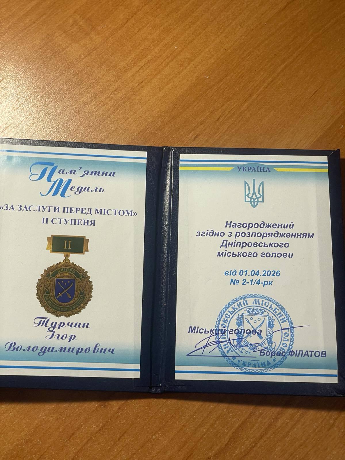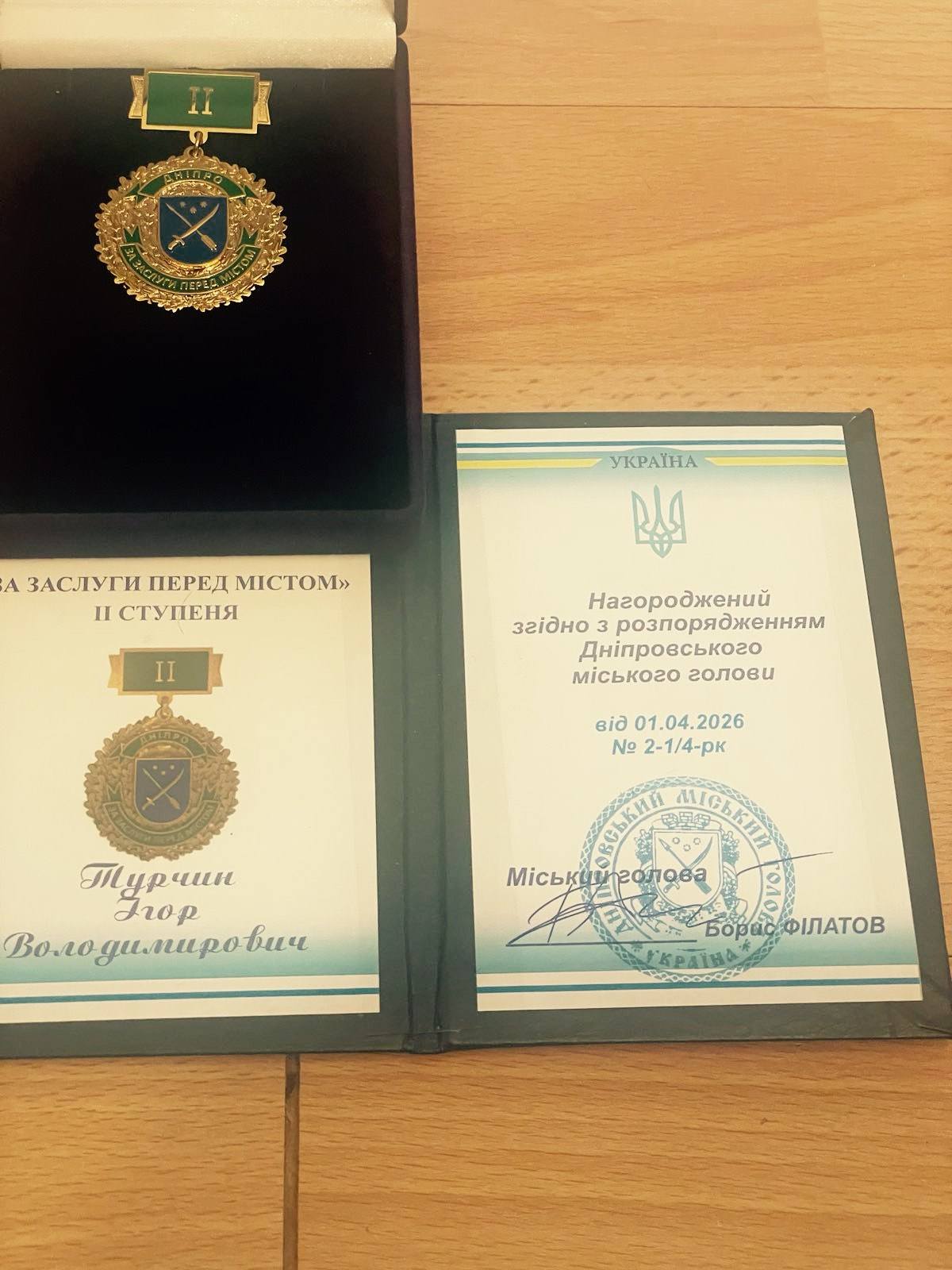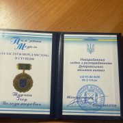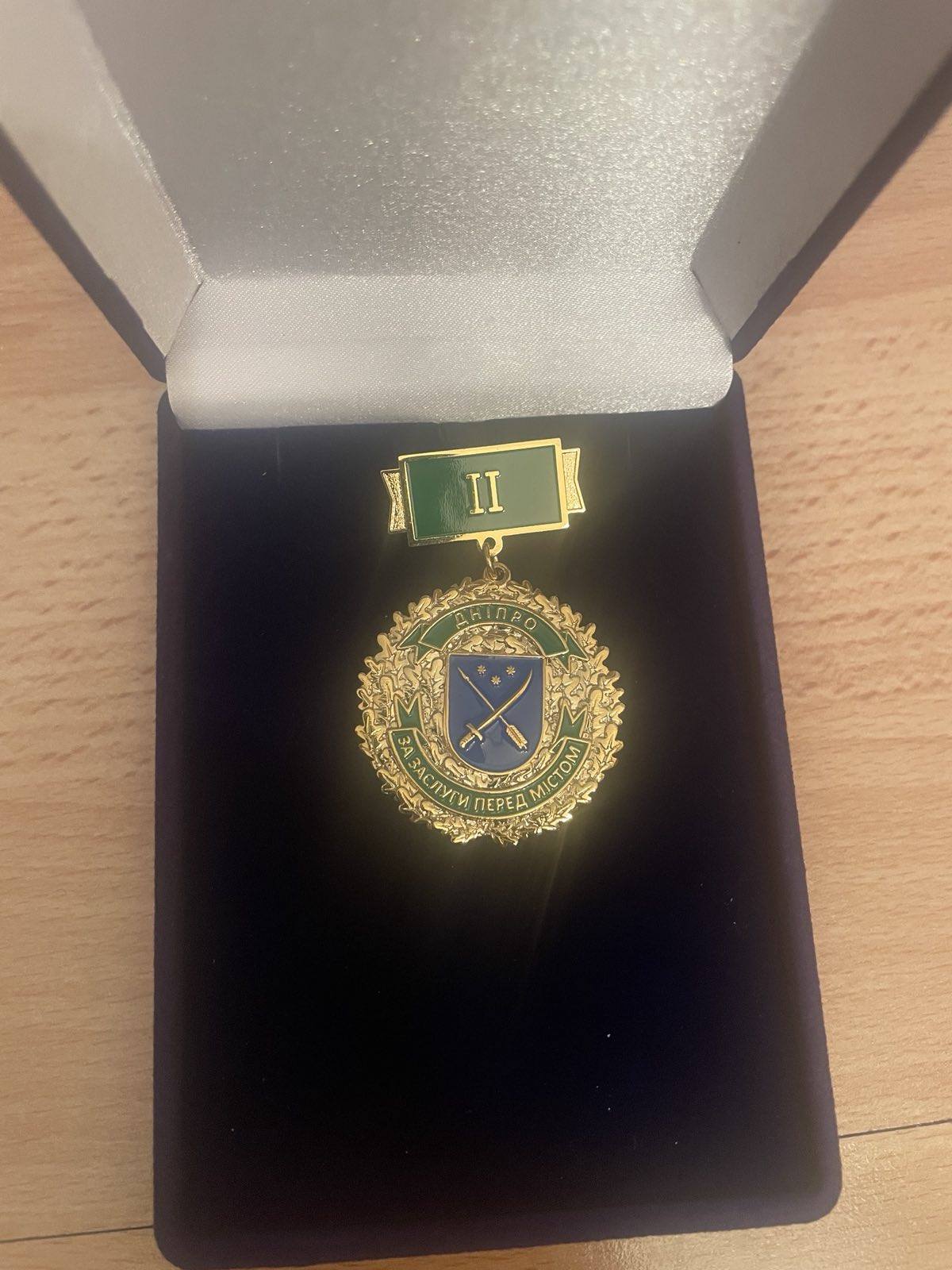 Розпорядженням міського голови Дніпра Бориса Філатова нагороджений відзнакою “За заслуги перед містом” ІІ ступеня під номером 5